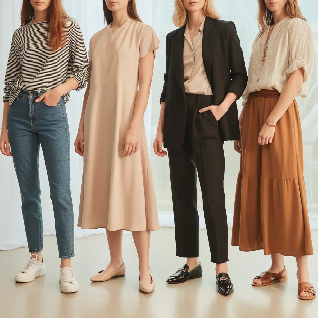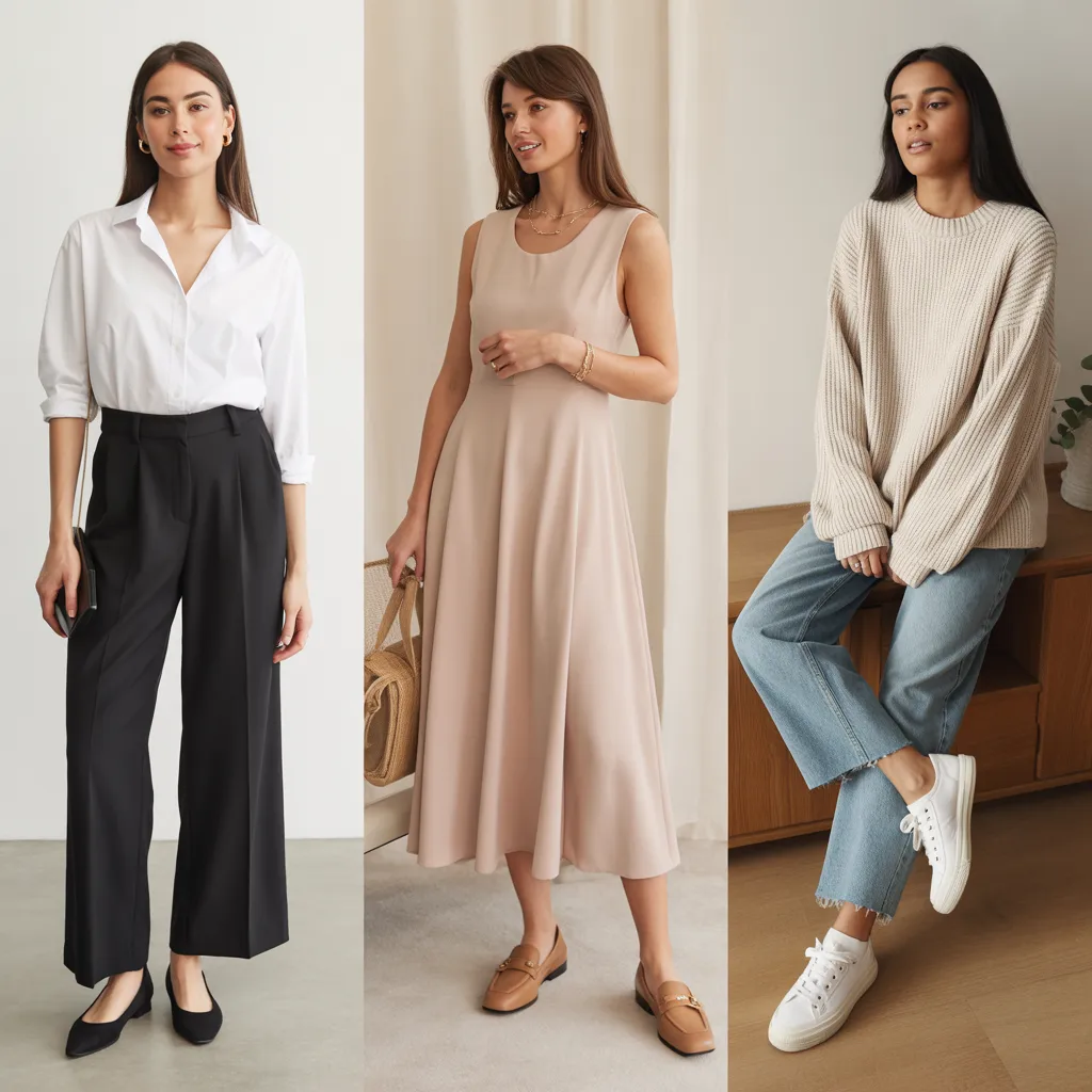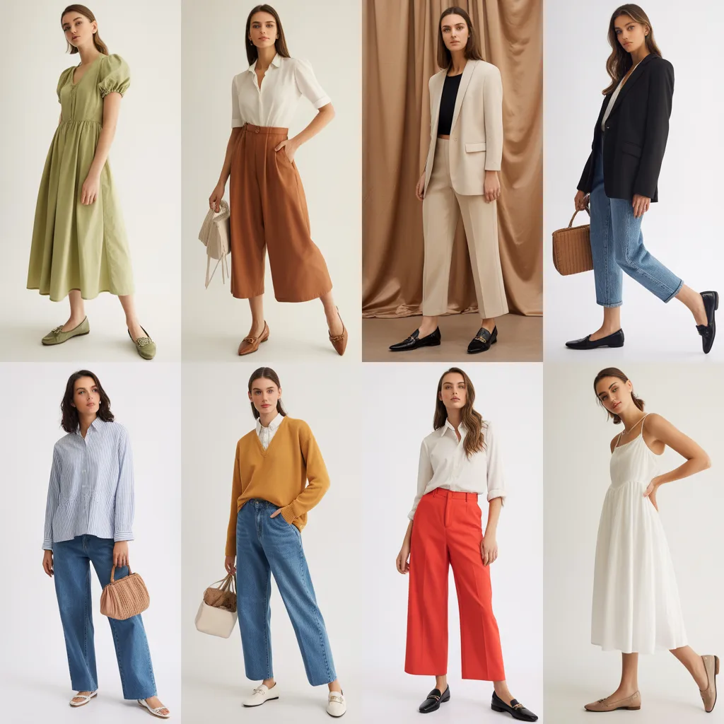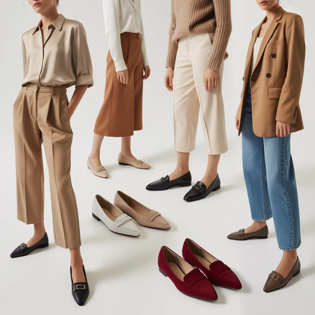 The strength of a great flats outfits wardrobe is its range. The same foundational pieces — a good blazer, tailored trousers, a wrap dress, a quality denim — transform completely depending on which flat shoe you pair them with and how you style the details.